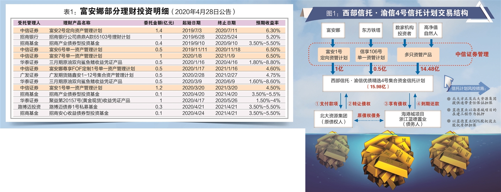 中信证券对富安1号的第1期投资始于2018年4月20日,金额1亿元,资金投向中海信托“泰州鑫泰”信托计划;第2期投资始于2018年5月22日,金额也是1亿元,资金分别投向中信信托“鸿业15号”、中海信托“汇信2016-52云南城投”信托计划。