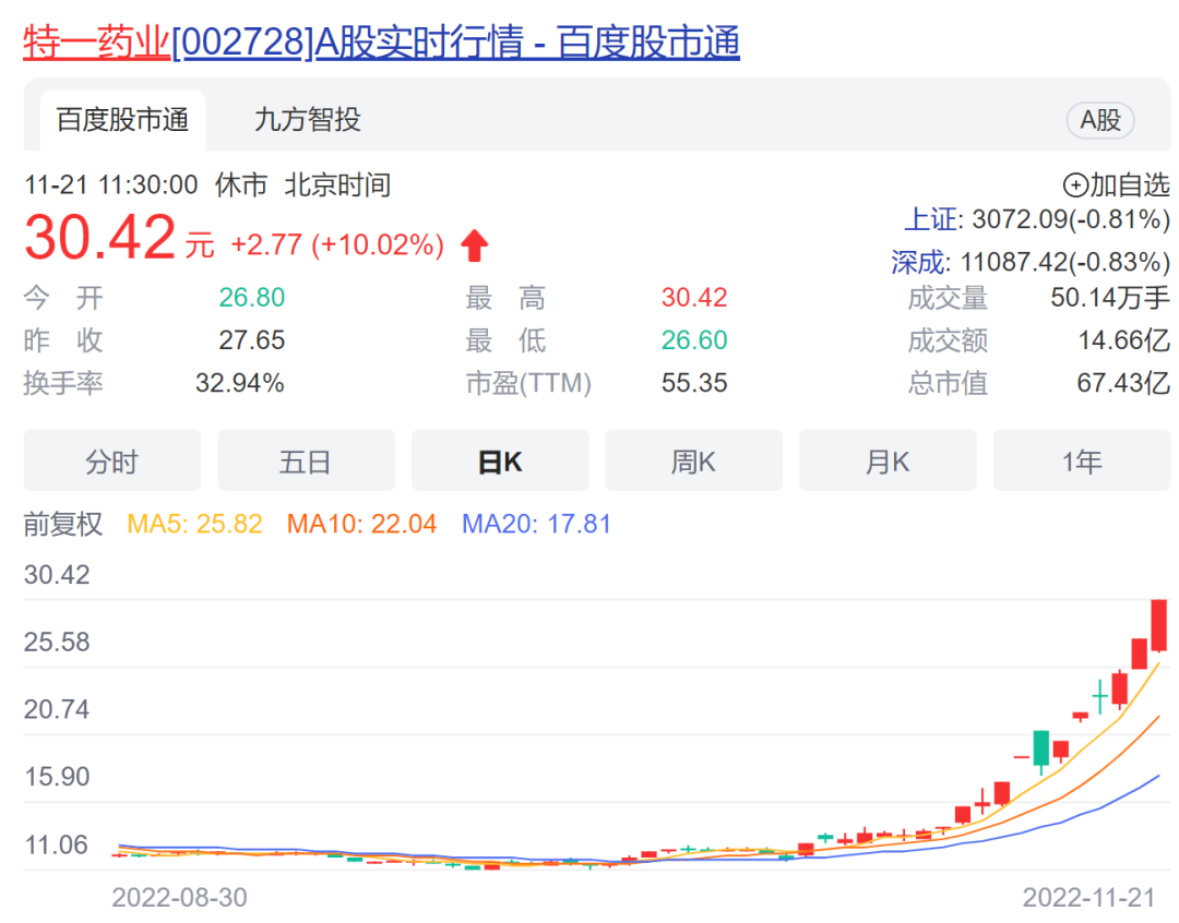受疫情反复影响,新冠检测和新冠药板块早盘大幅活跃。新冠检测低开高走,由盘初跌逾1%,转最高涨逾2%,创7个多月来新高,明德生物、九安医疗等强势涨停。新冠药概念板块亦一度放量涨近2%,同样创7个月来新高,特一药业11天7板,太龙药业、河化股份等涨停。