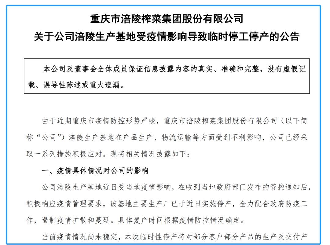 今日,涪陵榨菜公告,公司涪陵生产基地近日受当地疫情影响,在收到当地政府部门发布的管控通知后,积极响应疫情管理要求,该基地主要生产厂已于近日实施停产,全力配合政府防疫工作,遏制疫情扩散和蔓延。具体复产时间根据疫情防控情况确定。