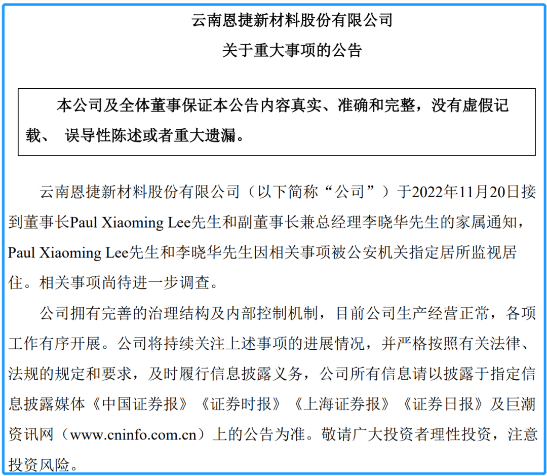 11月21日晚间,恩捷股份(002812)发布公告,于11月20日接到董事长Paul Xiaoming Lee(下称“李晓明”)及副董事长李晓华家属通知,二人因相关事项被公安机关指定居所监视居住,相关事项尚待进一步调查,目前公司经营正常。公开资料显示,李晓明与李晓华为兄弟关系,系恩捷股份实际控制人,2022年位列《胡润百富榜》云南富豪前两名。