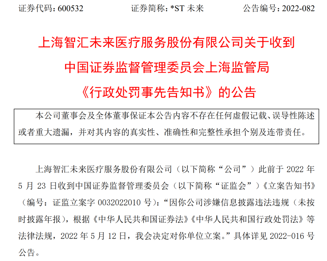 对于年报逾期行为,今年5月份,*ST未来就因涉嫌信息披露违法违规(未按时披露年报),收到了证监会立案告知书。当月,退市环球、退市济堂、*ST辅仁等多家年报逾期公司也相继被立案。