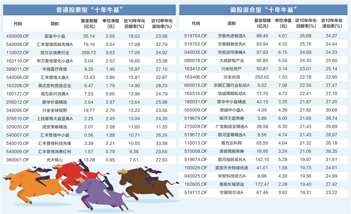 短期来看,基金收益受市场波动影响较大;中长期收益则由基金经理投资风格、理念、流程以及团队投研实力等多因素决定。数据宝以近十年年化回报率为标准,统计出普通股票型和偏股混合型牛基。