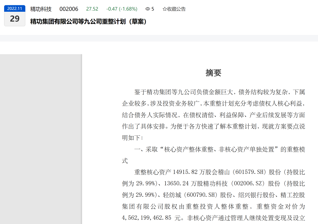 其中包括精功集团所持会稽山股份中的1.49亿股,持股比例为29.99%,资产价值18.73亿元;精功集团所持精功科技中1.37亿股,持股比例为29.99%,资产价值11.85亿元;浙江精功控股有限公司持股轻纺城6370万股,持股比例为4.35%,资产价值1.99亿元;精功集团等公司合计持有的3.33亿股绍兴银行股份,持股比例9.41%,资产价值5.86亿元。另外还包括精比控股集团有限公司股权,这些都是本次重整的核心资产。