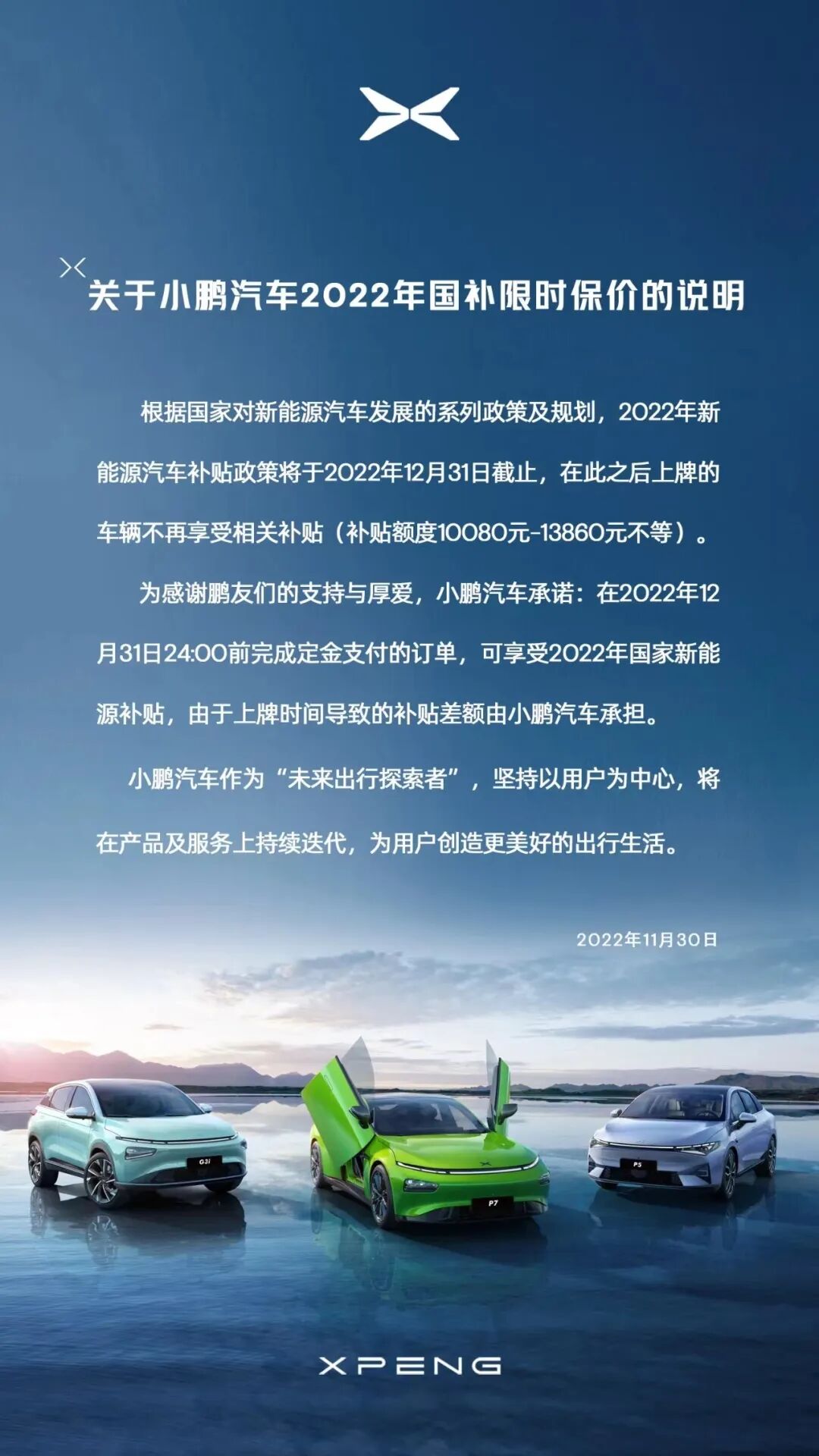 在此之前,小鹏汽车也推出了限时保价政策,承诺在2022年12月31日前,完成定金支付的订单,不受交付时间影响,将持续享受2022年国家新能源补贴。保价政策覆盖小鹏P7、小鹏P5、小鹏G3i三款车型,2022年国补补贴退坡差额在10080-13860元之间。
