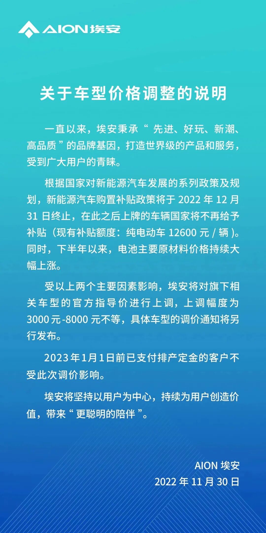 11月23日,比亚迪宣布将对王朝、海洋及腾势相关新能源车型的官方指导价进行调整,上调幅度为2000—6000元不等;11月30日,埃安对旗下车型进行3000至8000元不等的价格上调。