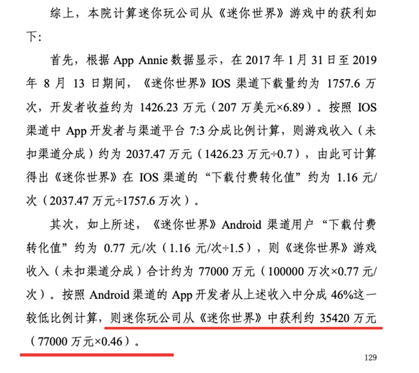 不过,法院结合《迷你世界》的下载量,经过计算认为,迷你玩公司从《迷你世界》中获利最高达到约3.54亿元,扣除服务器成本后,全部获利约为3.16亿元。