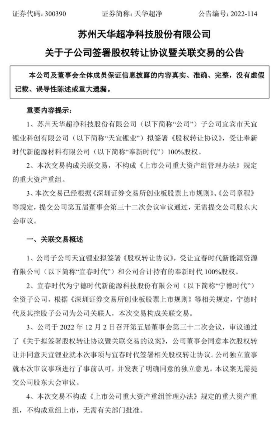 转让前,宁德时代旗下宜春时代新能源资源有限公司持有奉新时代90%股权,天华超净持有奉新时代10%股权。转让完成后,天华超净将通过天宜锂业,持有奉新时代100%股权。