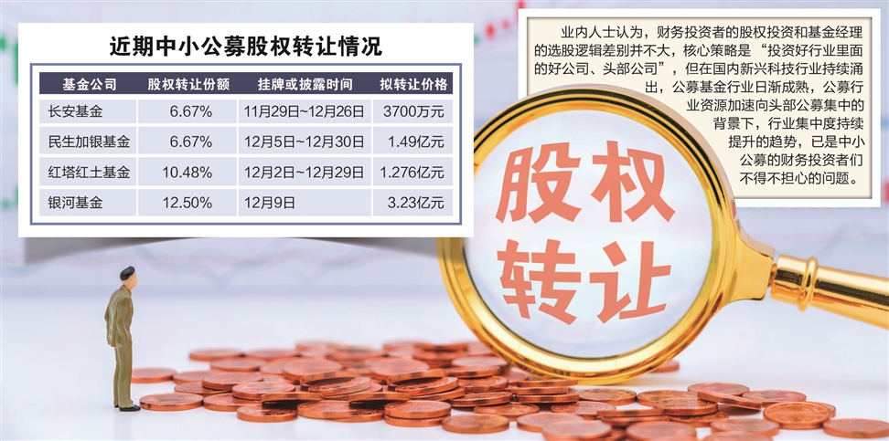 证券时报记者注意到,趁着中小公募仍有可观的盈利能力,今年最后一个月内中小基金公司密集出现股权转让现象,包括银河基金、长安基金、红塔红土基金、民生加银基金等,部分投资者所持的基金公司小部分股权,多次转让也未能成交,上述公募基金股权变更,均指向具有财务投资者身份的小股东。