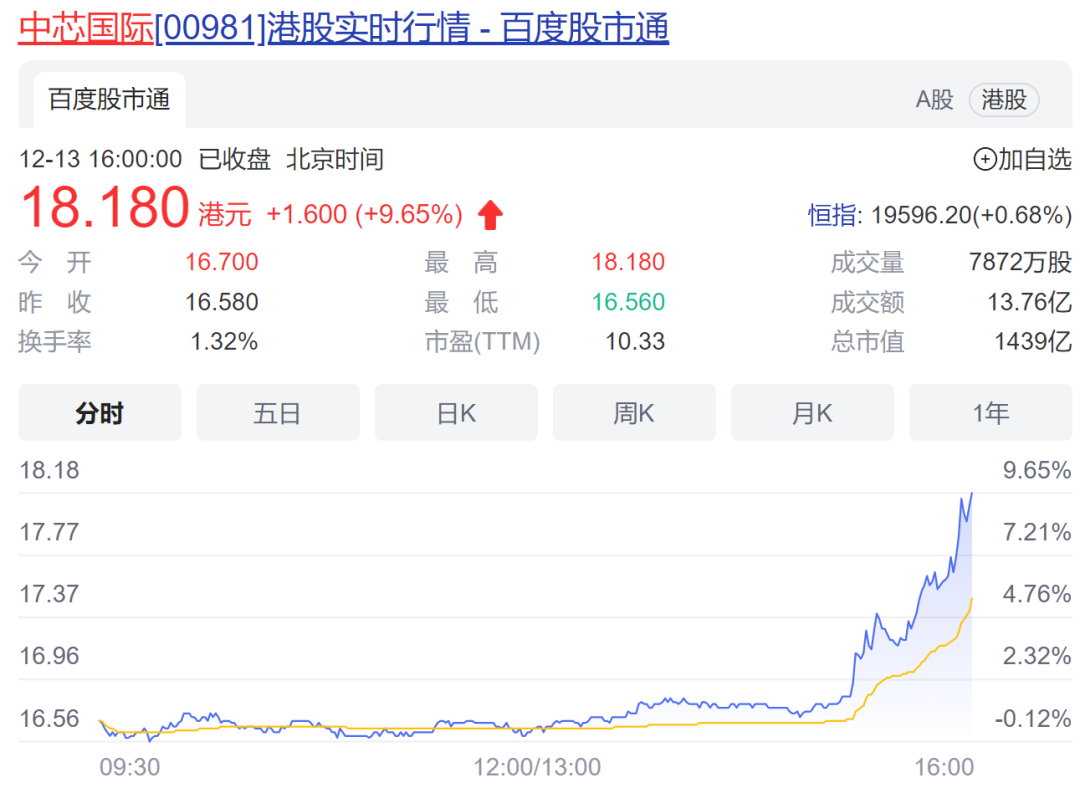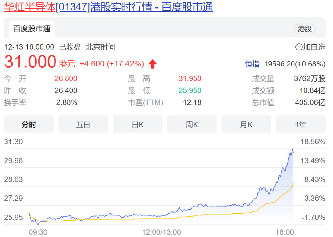 12月13日,恒生指数收涨0.68%,港股半导体板块获拉升,晶圆代工双雄股价尾盘急涨,港股华虹半导体收涨17.42%,并获南下资金净买入2.61亿港元;港股中芯国际上涨9.65%。