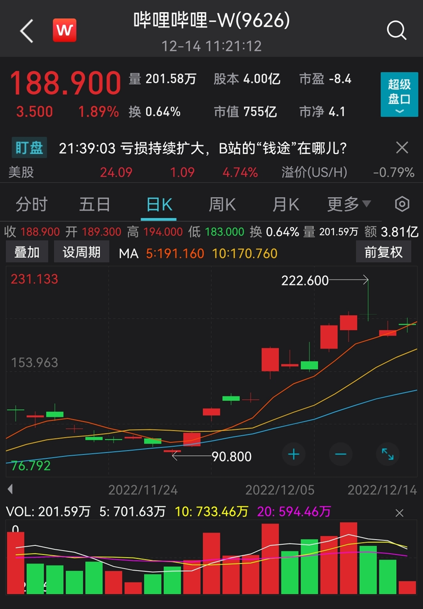 《三体》动画开播消息公布后,作为播出平台的B站股价就持续大涨。Wind信息显示,从11月28日至12月13日,B站港股涨幅达到87%,多个交易日涨幅超过20%。