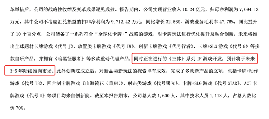 2021年9月,游族网络进一步表示,公司拥有《三体》的游戏版权,将通过自研、外部定制、合作开发等不同方式去推进,会有2-3款游戏启动。