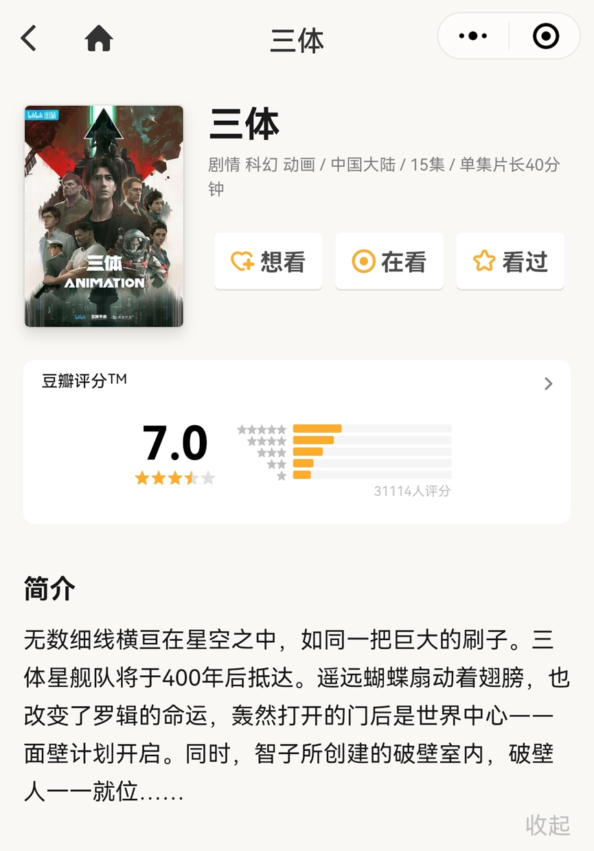 12月13日,《三体》豆瓣开分7.1分,目前已降至7.0分。在国产动画剧集中,这已经算一个不错的评分。