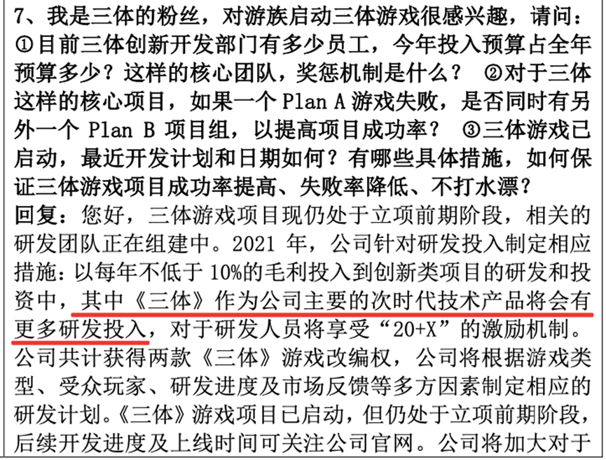 2021年5月,游族网络介绍,公司共计获得两款《三体》游戏改编权,目前项目已启动,但仍处于立项前期阶段,相关的研发团队正在组建中。公司针对研发投入制定了相应措施,《三体》作为公司主要的次时代技术产品,将会有更多研发投入,研发人员将享受特别的激励机制。