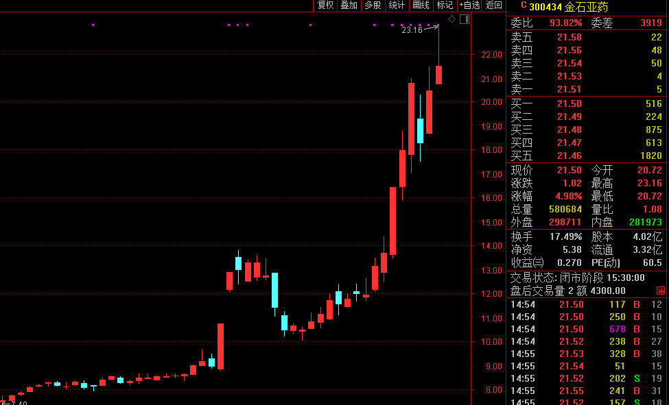 具体来看,金石亚药于12月15日接待了国金证券的单独调研,该股一周股价上涨30.78%,在前述新冠常用药概念股中涨幅领先。自11月24日至最新收盘日,金石亚药近17个交易日已走出翻倍行情,该股现价21.50元/股,当前市值约86亿元。