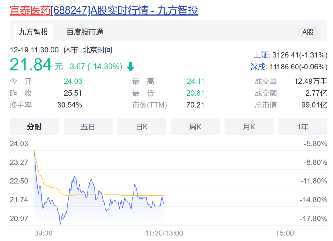 防疫概念股近期大幅波动,暴涨与暴跌之间频繁转换。今日防疫概念再度集体重挫,熊去氧胆酸盘中最多跌逾5%,龙头股宣泰医药开盘低开低走,一度大跌逾18%;九典制药开盘也直线闪崩,大跌超10%;众生药业、上海凯宝等纷纷大跌。