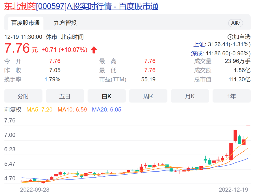 值得关注的是,近期因“2元20片退烧药”走红的东北制药,上午开板即拉出一字板,录得5天3板。