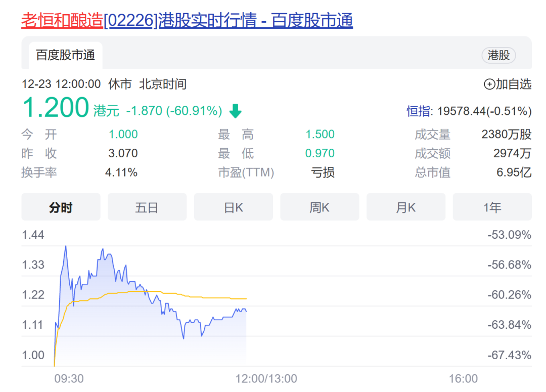 百年老字号老恒和酿造港股在停牌21个月后,今日复牌交易,开盘一度低开近70%,后虽有所反弹,截至收盘,跌幅仍高达逾60%,成交急剧放大至停牌前的20倍以上。
