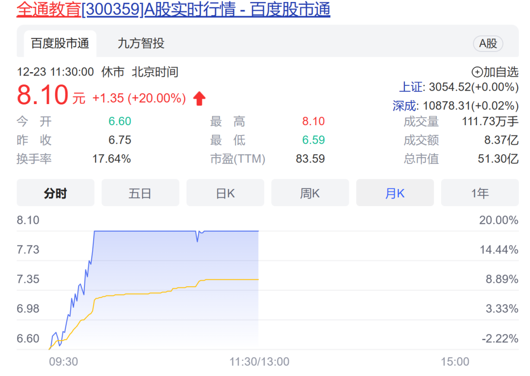 职业教育板块早间略微低开后快速上攻,涨逾3%,半日成交接近昨日前天成交。全通教育直线拉20%涨停,股价创2年来新高;世纪鼎利、华媒控股、国脉科技、中广天择等亦涨停或涨超10%。