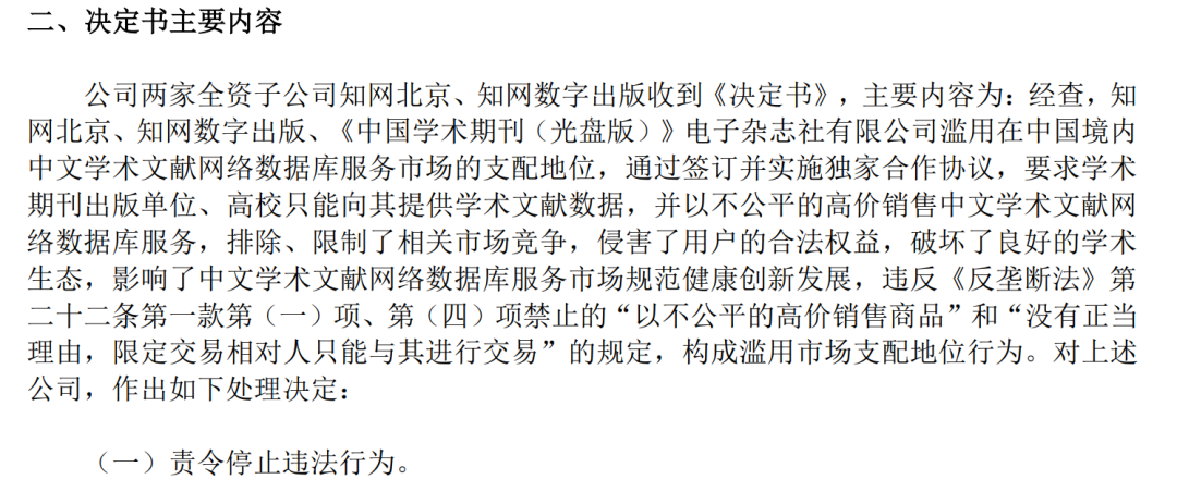 根据市场监管总局公告披露,知网在中国境内中文学术文献网络数据库服务市场具有支配地位,2014年以来,知网滥用该支配地位实施垄断行为: