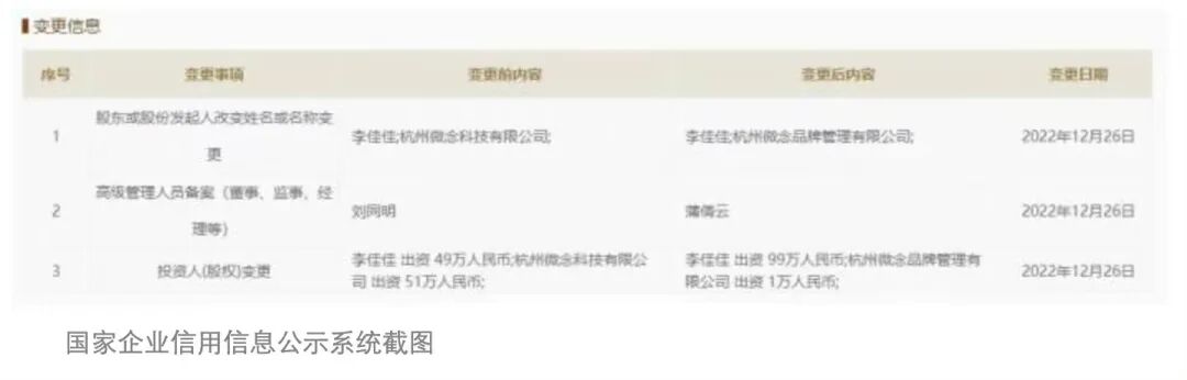 这则一句话声明发布的同时,持有所有“李子柒”商标的四川子柒文化传播有限公司(简称“子柒文化”)发生工商变更,微念方面持股比例由51%降至1%,且微念大股东刘同明退出高管行列。
