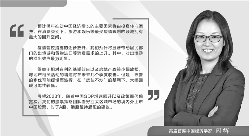 闪辉表示,受低基数以及疫情防控优化措施超预期等因素影响,预计明年中国经济会有明显恢复,因此高盛将明年中国经济增速预期从4.5%上调至5.2%。明年推动中国经济增长的主要因素将转向消费,旅游和娱乐等最受疫情限制的消费领域拥有最大的回升空间。此外,明年增长预期改善等有利因素有望推动人民币兑美元汇率小幅走强。高盛股票策略分析团队也看好亚太区域市场的境内外上市中国股票,维持对A股和港股超配的建议。