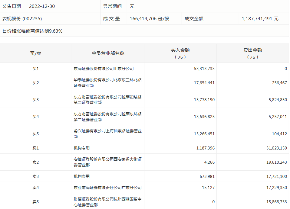 证券时报网讯,安妮股份今天涨停。盘后数据显示,2个机构出现在龙虎榜单上,合计净卖出4688.29万元;华泰证券股份有限公司北京东三环北路证券营业部买入1765.44万元,同时卖出25.65万元;安信证券股份有限公司西安朱雀大街证券营业部买入0.43万元,同时卖出1961.02万元。