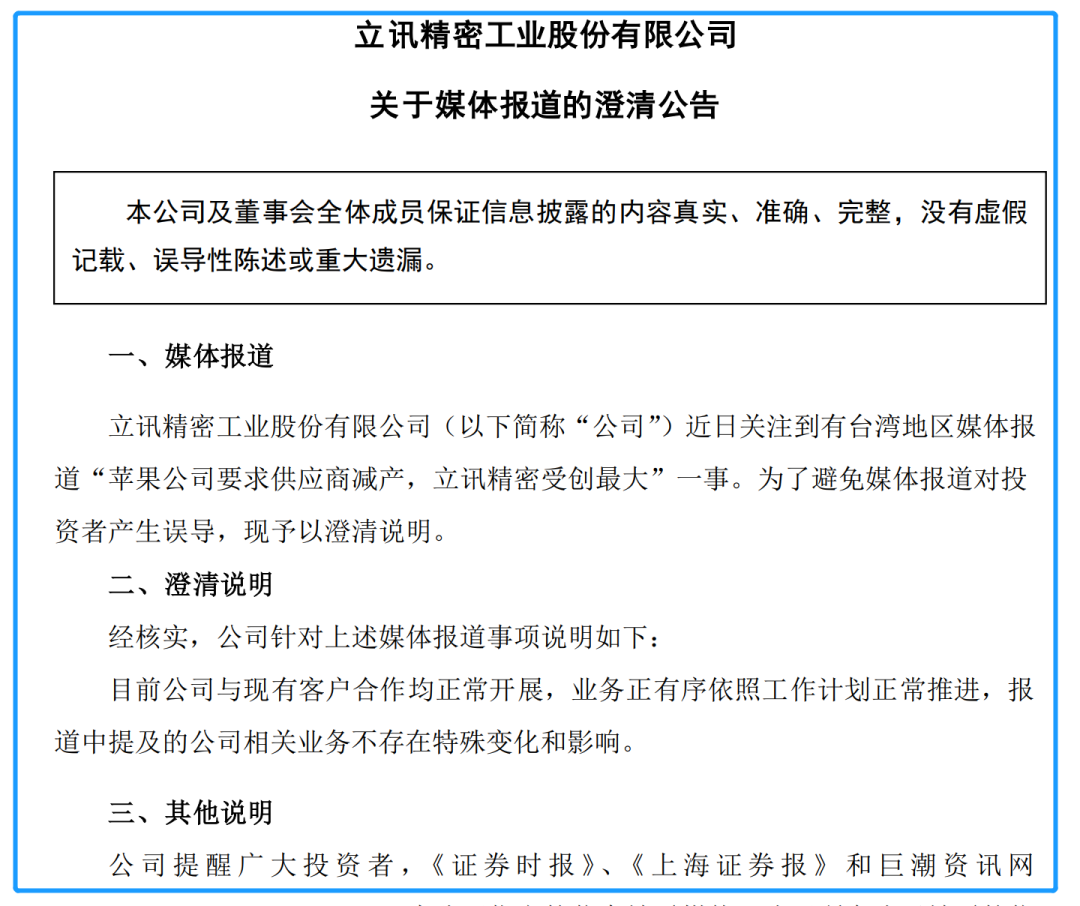 立讯精密今日一大早公告,近日关注到有台湾地区媒体报道“苹果公司要求供应商减产,立讯精密受创最大”一事。经核实,公司针对上述媒体报道事项说明如下:目前公司与现有客户合作均正常开展,业务正有序依照工作计划正常推进,报道中提及的公司相关业务不存在特殊变化和影响。