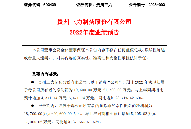 受益于12月份市场对于新型冠状病毒感染治疗相关药品需求大幅提升,去年前三季度业绩同比下滑的贵州三力(603439),成功在四季度扭转经营颓势,2022年全年净利润有望实现近42.5%的同比增幅。