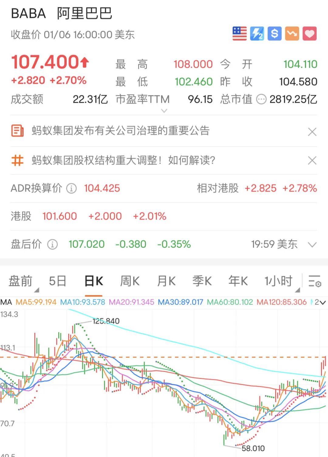市场表现来看,消费金融平台增资获批后,港股阿里巴巴-SW股价迎来跳涨,2023年开年后累计上涨17.8%,最新报收101.6港元;同期美股阿里巴巴股价涨幅高达21.92%。