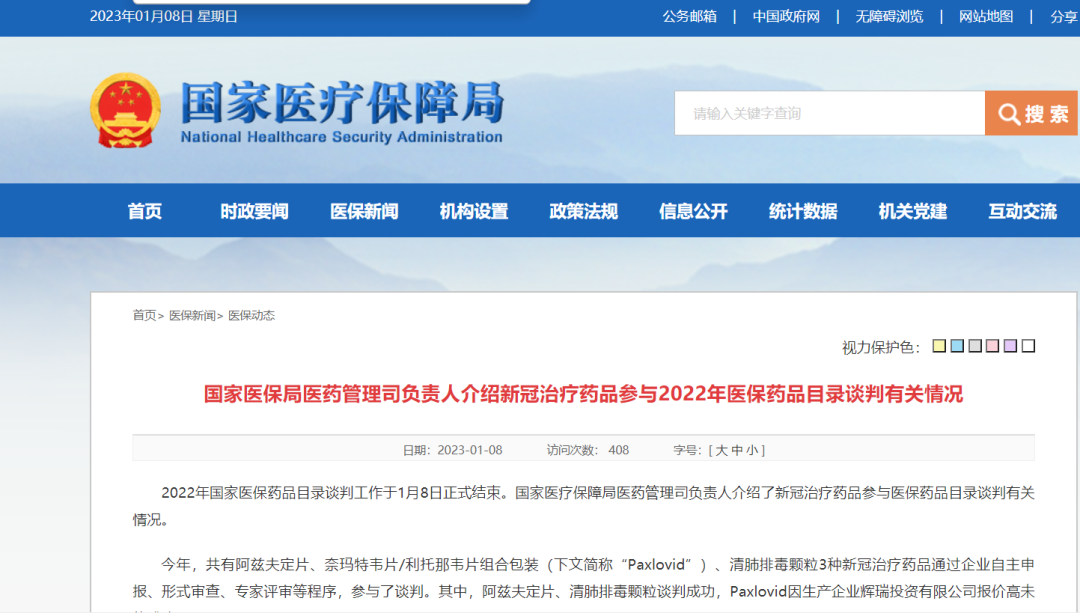 今年,共有阿兹夫定片、奈玛特韦片/利托那韦片组合包装(下文简称“Paxlovid”)、清肺排毒颗粒3种新冠治疗药品通过企业自主申报、形式审查、专家评审等程序,参与了谈判。其中,阿兹夫定片、清肺排毒颗粒谈判成功,Paxlovid因生产企业辉瑞投资有限公司报价高未能成功。