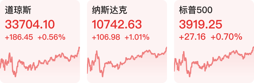 美股三大指数集体收涨,纳指涨1.01%,标普500指数涨0.7%,道指涨0.56%。大型科技股全线上涨,奈飞涨近4%,亚马逊、脸书涨超2%,苹果、微软、谷歌小幅上涨。热门中概股普涨,纳斯达克中国金龙指数涨1.73%。富途控股涨超5%,蔚来涨超4%,网易、阿里巴巴、微博涨超3%,小鹏汽车涨超2%。
