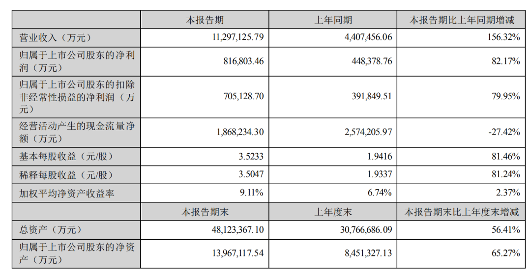 根据此前公布的报告,宁德时代2022年上半年实现营业收入1129.7亿元,同比增长156%;实现扣非净利润70.5亿元,同比增长80%。而2022年前三季度公司实现营收2103.4亿元,同比增长186.7%;扣非净利润160.4亿元,同比增长142.9%。