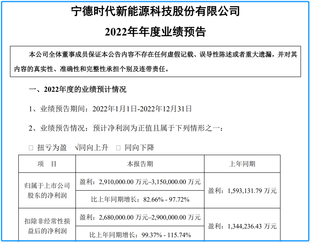 从此次业绩预告来看,宁德时代2022年第四季度单季盈利明显超过此前三个季度。