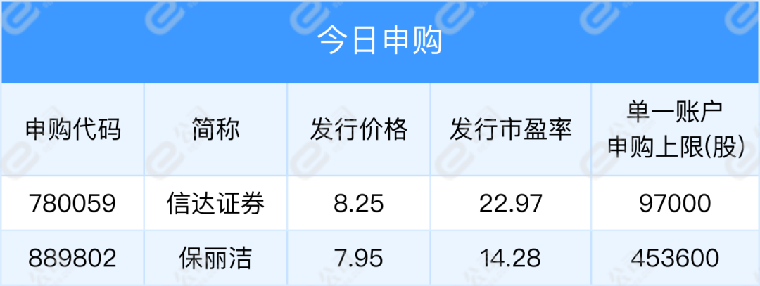 信达证券、保丽洁今日新股申购;