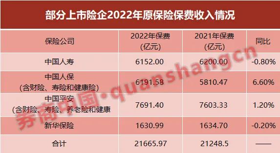 2022年全年,中国人寿累计原保险保费收入为6152亿元,同比下降0.8%,新华保险原保险保费收入为1630.99亿元,同比下降0.2%。