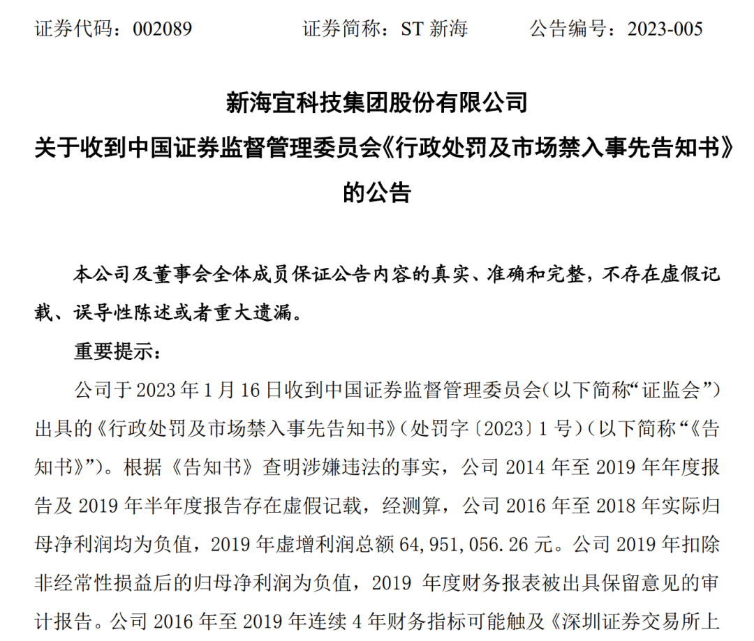 根据《事先告知书》查明涉嫌违法的事实,ST新海2014年至2019年年报及2019年半年报存在虚假记载。