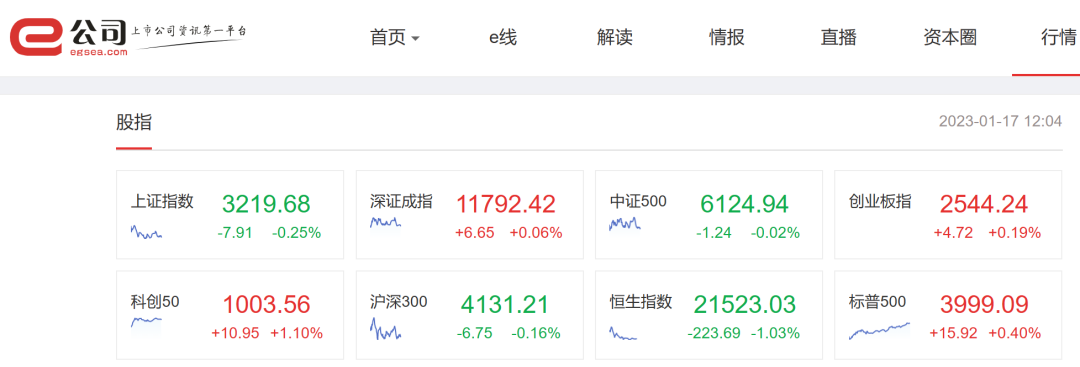 1月17日三大指数微幅高开后维持横盘震荡,沪指走势较弱。截至午间收盘,沪指跌0.25%,深证成指涨0.06%,创业板指涨0.19%。