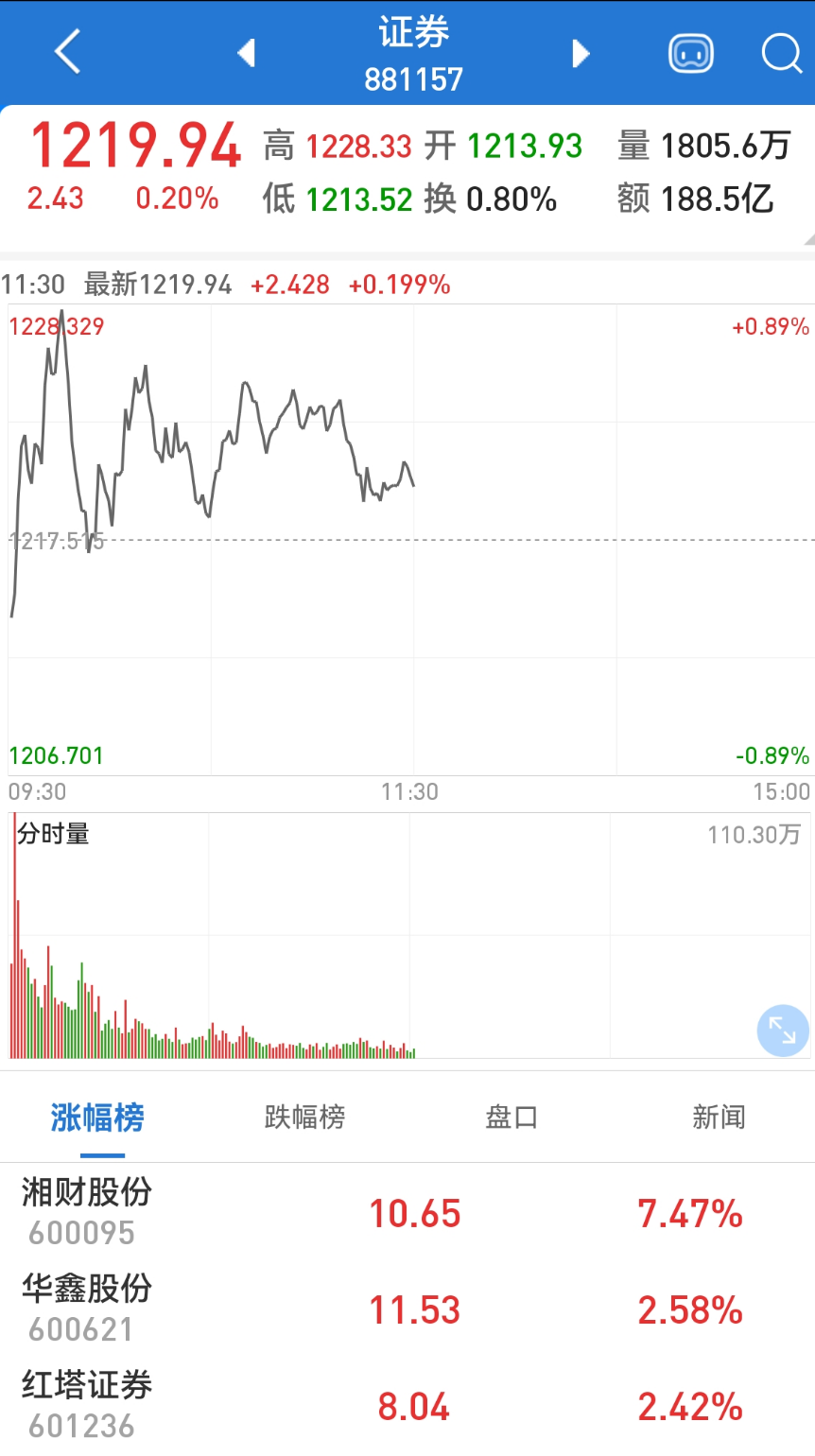 “牛市旗手”继续反攻,券商股开盘拉升,湘财股份早盘一度实现3连板,国盛金控涨一度超5%,华鑫股份、东方证券、财达证券、红塔证券、首创证券等跟涨,但截至午间收盘纷纷冲高回落。