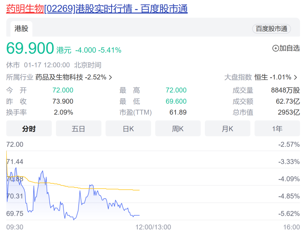 受大股东折价4%减持套现近40亿港元影响,药明生物早盘低开2.57%,截至发稿下跌5%,最新报70.1港元,总市值2966亿港元。
