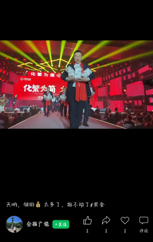 具有视觉冲击力的现场发钱仪式,加上知名歌手助阵,使得1月17日晚,河南矿山抖音号的年会直播吸引点赞超11万,相关消息更是冲上微博热搜榜。
