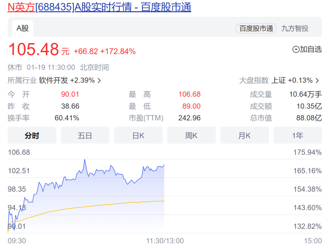 1月19日上午,新股英方软件登陆科创板。早盘以90.01元高开,此后股价一路飙升。截至发稿,N英方股价来到105.48元/股,涨幅172%。