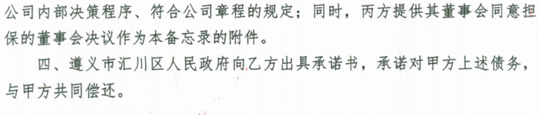 吴天华向记者表示,2019年12月16日,遵义经济技术开发区投资建设有限公司和遵义市汇川区娄海情旅游发展投资有限公司为汇川城投欠付的债务承担连带保证责任,汇川区政府也承诺共同偿还上述债务,“各方就上述偿债事宜形成《备忘录》,但他们至今未履行任何付款责任。”
