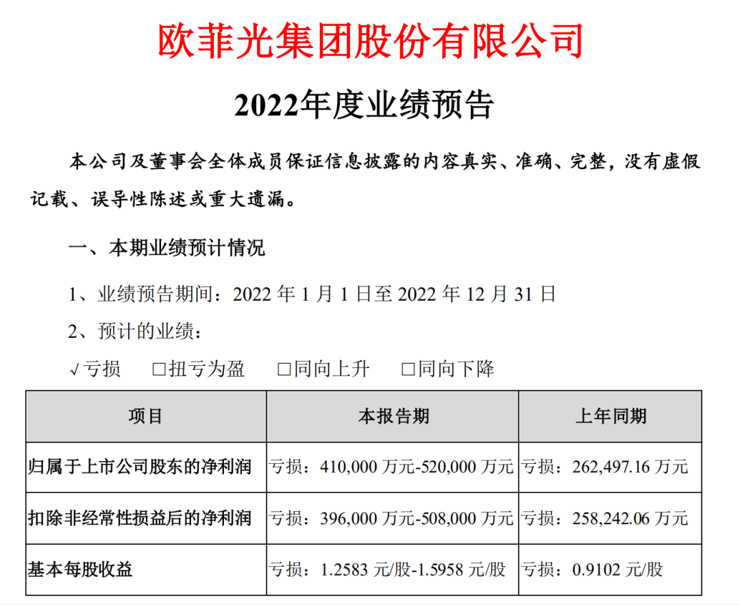 欧菲光(002456)1月30日晚间披露2022年度业绩预告,公司预计去年亏损41亿元-52亿元,上年同期亏损26.25亿元。预计扣除非经常性损益后的净利亏损39.6亿元-50.8亿元,上年同期亏损25.82亿元。