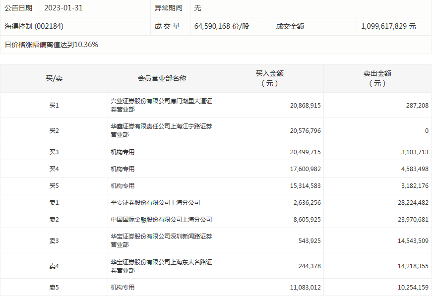 证券时报网讯,海得控制今天涨停。盘后数据显示,4个机构出现在龙虎榜单上,合计净买入4337.47万元;兴业证券股份有限公司厦门湖里大道证券营业部买入2086.89万元,同时卖出28.72万元;中国国际金融股份有限公司上海分公司买入860.59万元,同时卖出2397.07万元。