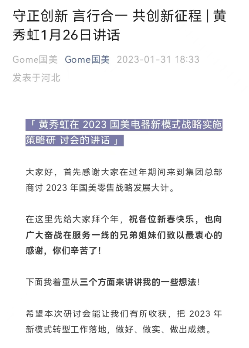 1月31日,国美电器官方微信号Gome国美发文称,黄秀虹在内部会上表示,“2022 年也是国美艰难的一年,生存的问题再一次摆到面前,活下去成为了我们发展的核心要务。不管是线上业务的发展还是线下门店的革新,我们好像总是打不到关键点上,总是在试错,是战略规划的问题还是战术打法的问题?这些都值得我们不断反思。”
