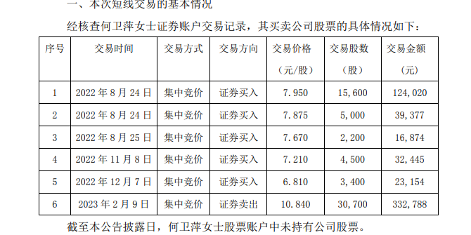 公告显示,经与董事长毛伟沟通,其事先并不知晓何卫萍的证券账户交易公司股票的相关情况,交易前后亦未告知何卫萍公司经营情况或其他内幕信息。何卫萍买卖公司股票行为,均为其本人对二级市场交易情况的独立判断而作出的决定,不存在利用内幕信息交易谋求利益的情形。