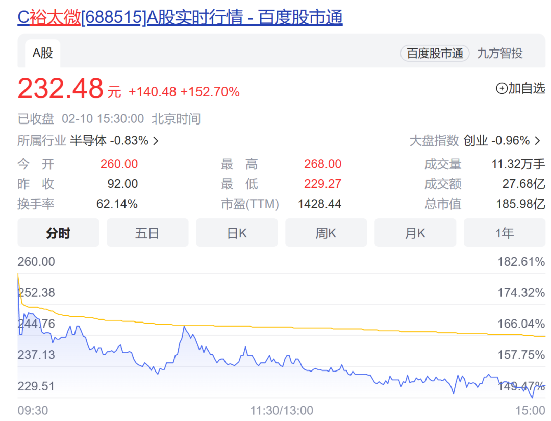 2月10日裕太微(688515)正式登陆科创板,发行价为92元,上市首日盘中最高涨至268元,最大涨幅为191.30%,中一签最高可赚88000元。截至收盘,裕太微股价为232.48元,涨幅达152.7%。