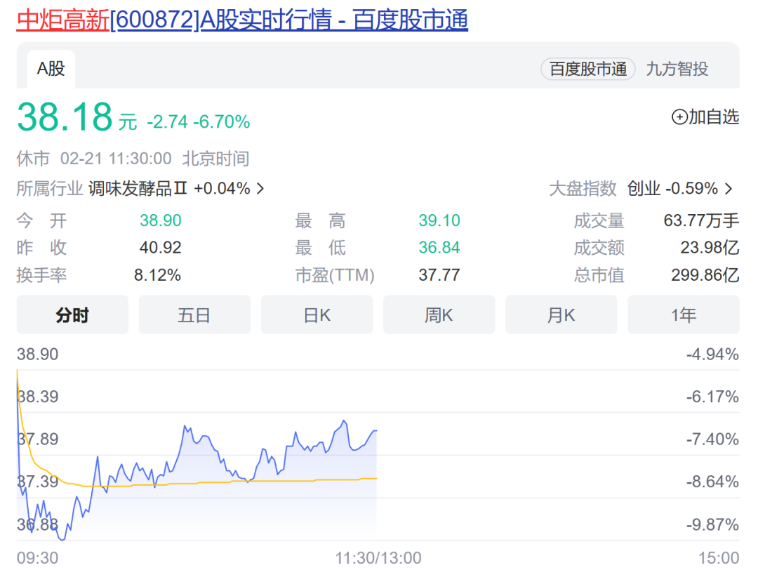21日开盘后,中炬高新股价低开低走,盘中一度跌停,截至午间收盘下跌6.70%。