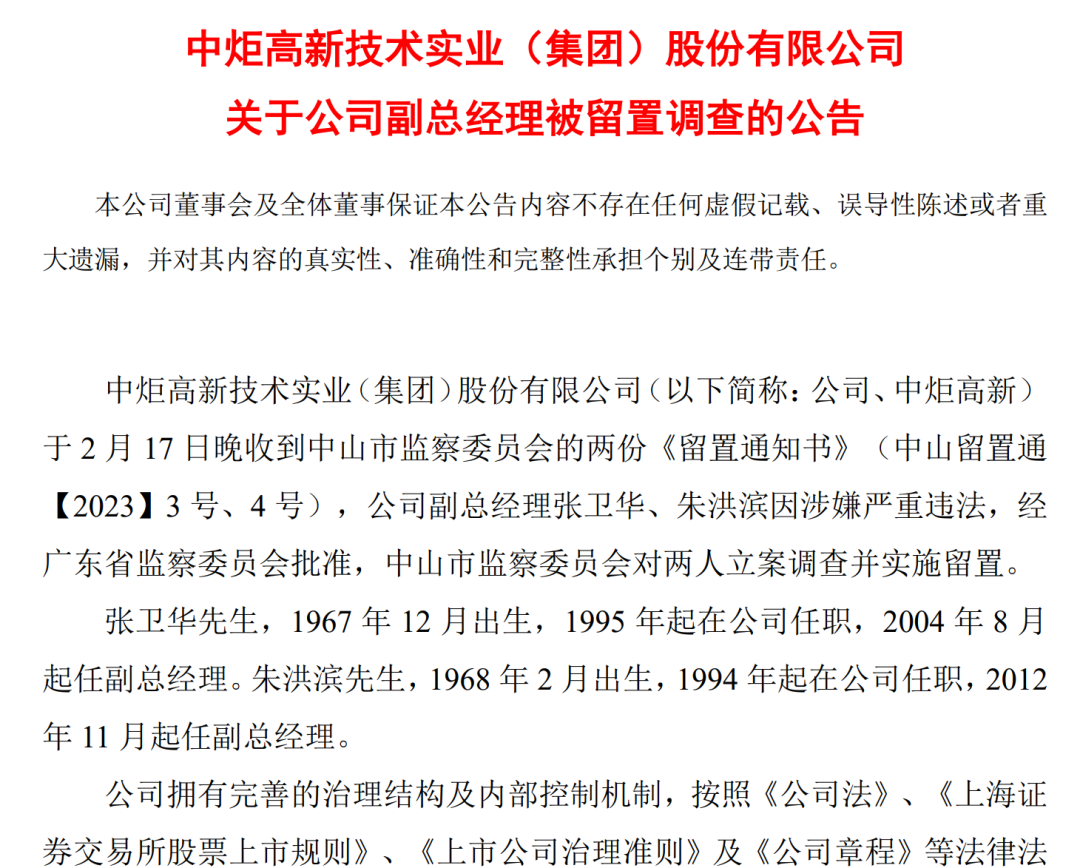 2月20日晚间,中炬高新公告,公司于2月17日晚收到中山市监察委员会的两份《留置通知书》,公司副总经理张卫华、朱洪滨因涉嫌严重违法,经广东省监察委员会批准,中山市监察委员会对两人立案调查并实施留置。公告称,公司尚未知悉上述高管被留置的具体原因。截至公告披露日,公司生产经营管理情况正常,该事项不会对公司正常生产经营造成影响。