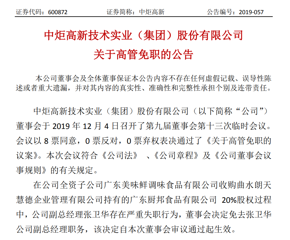 2019年12月5日,中炬高新公告称,在公司全资子公司广东美味鲜调味食品有限公司收购曲水朗天慧德企业管理有限公司持有的广东厨邦食品有限公司20%股权过程中,公司副总经理张卫华存在严重失职行为,董事会决定免去张卫华公司副总经理职务。